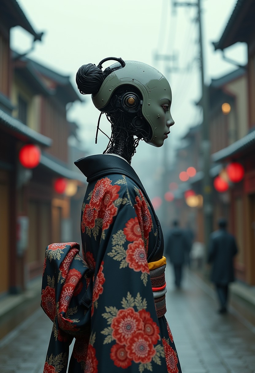 Creating an image of a female android in a beautiful kimono walking through the streets of Kyoto. The style is terrible, and the fusion of humans and robots has a mysterious and creepy atmosphere amidst the beauty. In the background is an old Japanese cityscape. It has a long neck made of machines and wears a mask. Imagine a strange and eerie picture - Ar 9:16. creepy atmosphere, fusion, horror, Japanese cityscape, long neck, robots, v 6