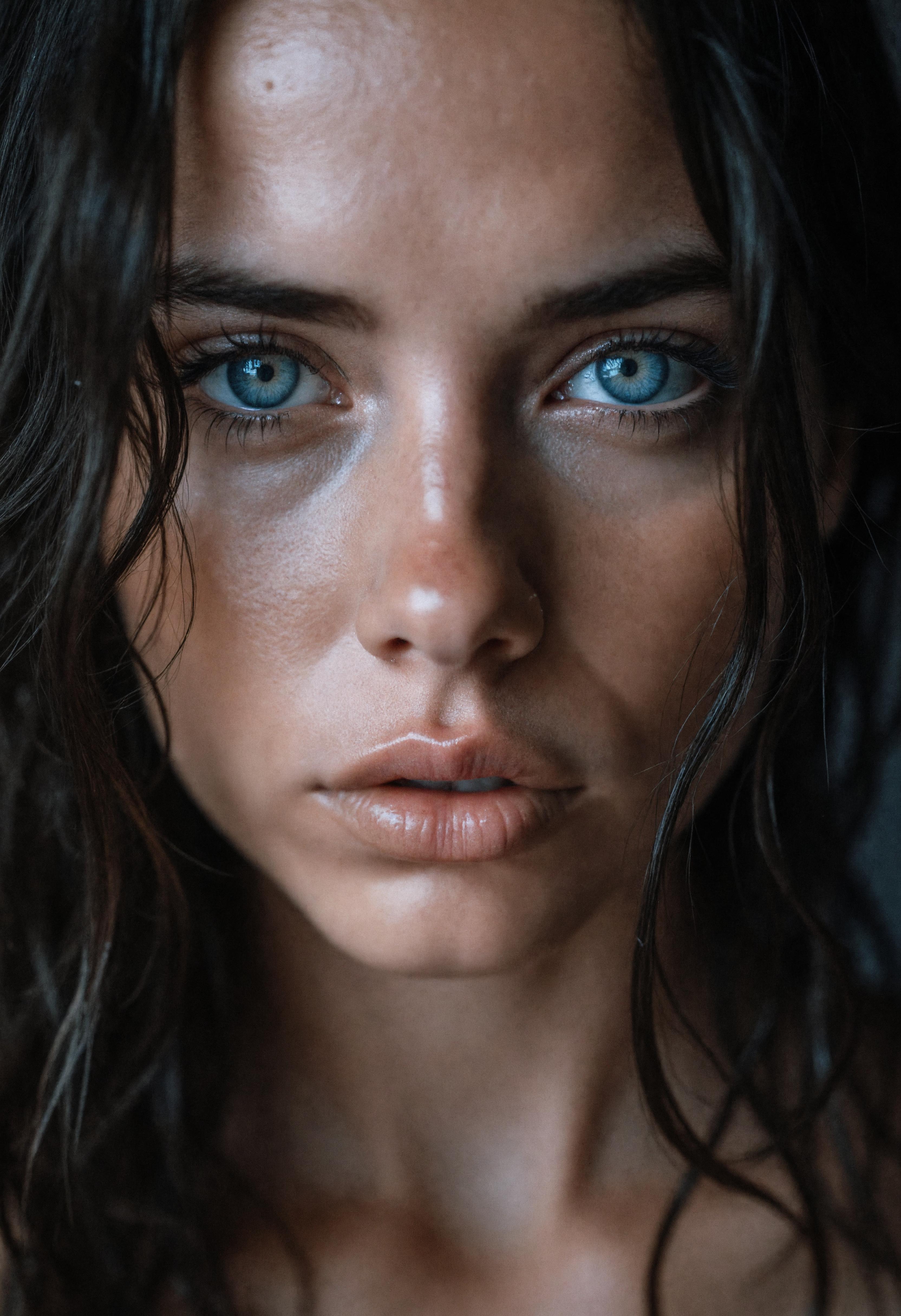 photography, portrait, close up of a woman's face, blue eyes and wet, glistening skin, her expression is intense and focused, the dark background accentuates the contrast and details of her features