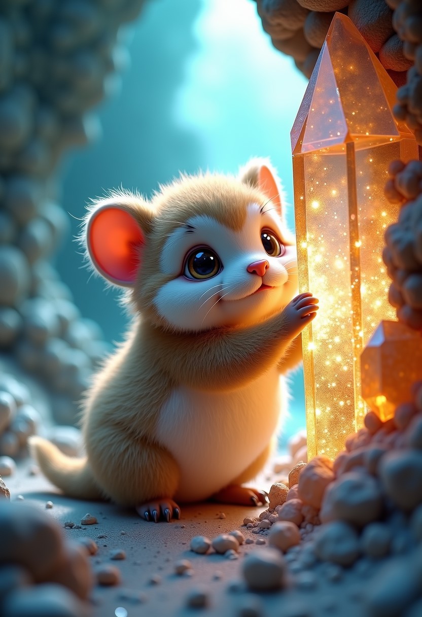 ,a picture of a of a small fat fluffy creature, whose fur is decorated with small polished crystals, which looks out curiously between two huge crystals, it holds on to the large crystals and leans forward slightly to take a close look at its surroundings, it is super cute and fluffy and looks at the viewer with big sparkling eyes, it's super cute how it looks up from the bottom, the scene takes place in a crystal cave, the walls are decorated with unpolished shiny crystals that reflect the light in the cave and everything on illuminate a harmonious and peaceful way,