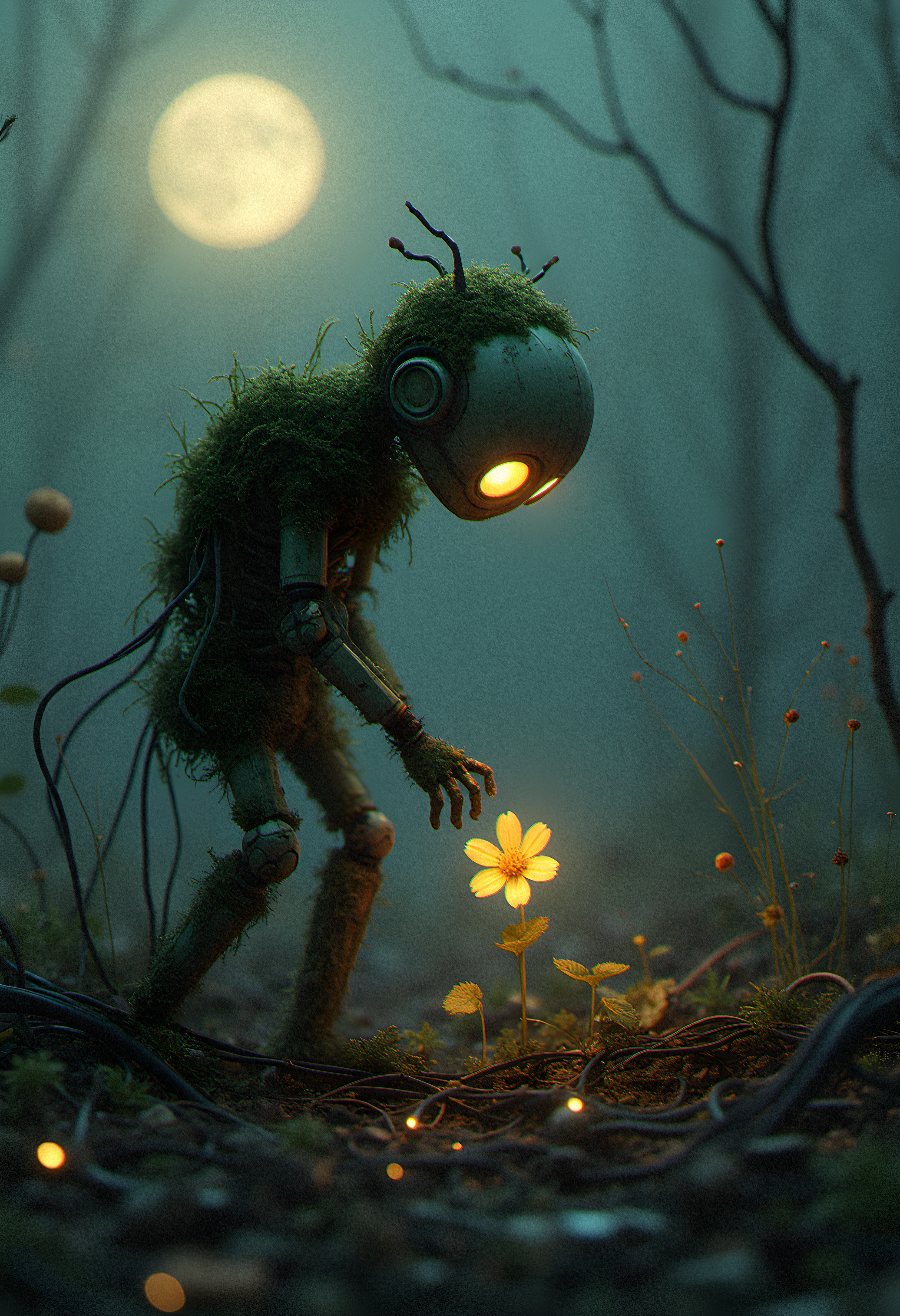 Digital Art: A melancholic, moss-covered robot with endearing round eyes gently leans forward under dim, moonlit lighting, tenderly watering a quaint, luminous flower amongst tangled circuits and cables sprawled across an electronic wasteland, style of Simon Stålenhag, Pascal Blanche, Vitaliy Shushko.