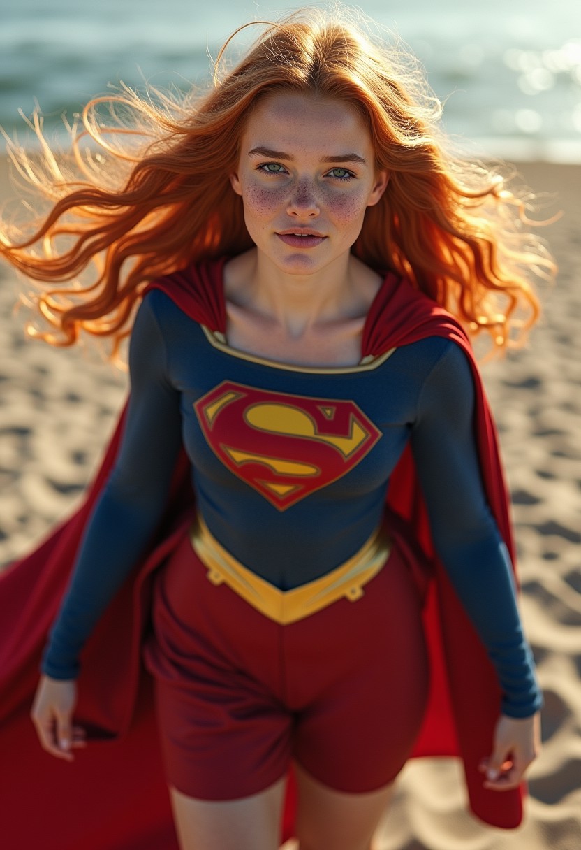 realistic, photograph, photo, photorealistic, high detail, 20 year old irish woman with wavy ginger hair and freckles in a supergirl costume, levitating, full body, hair waving in the wind