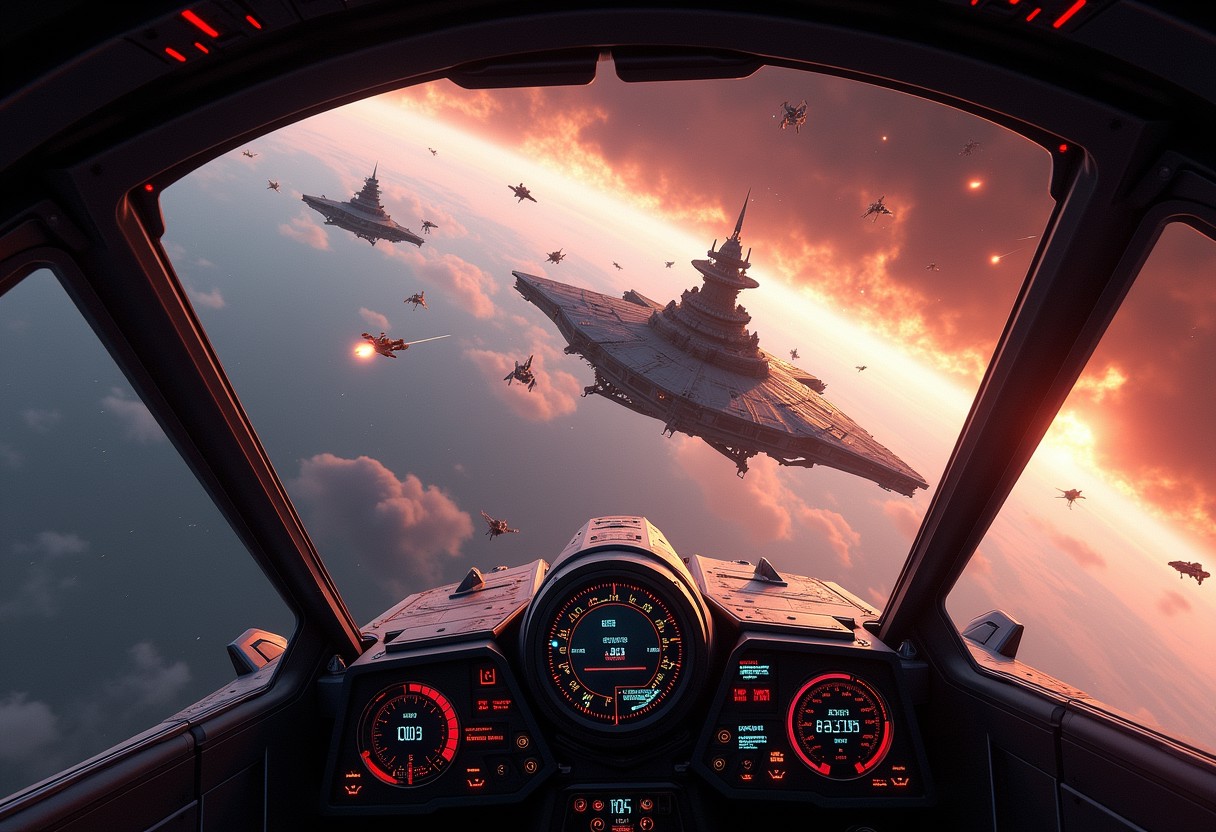 first person view, inside the cockpit of a futuristic space fighter, high-tech instrument panel visible, going in for an attack run against a large enemy capital ship while enemy fighters close in, lasers, explosions, dynamic, action scene, sci-fi, space combat