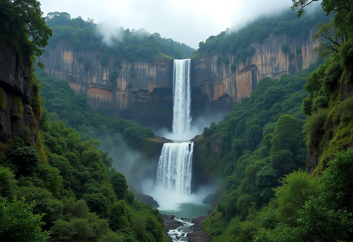 Vue en plongee d'une Magnifique cascade de tres grande hauteur, tombant en plusieurs ressauts d'un Tepuy et chutant dans une immense vasque rocheuse, dans un decor de foret equatoriale exuberante envahie par la vegetation. Partout de la mousse et des lianes. de nombreux bancs de brume s'accrochent a la gigantesque falaise
