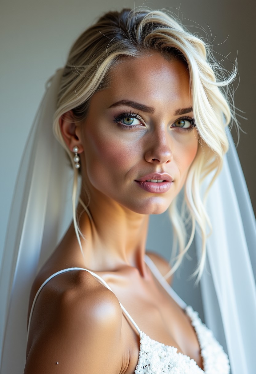 Beautiful woman Platinum-blonde wild hair, Swedish action shot of Veiled bride