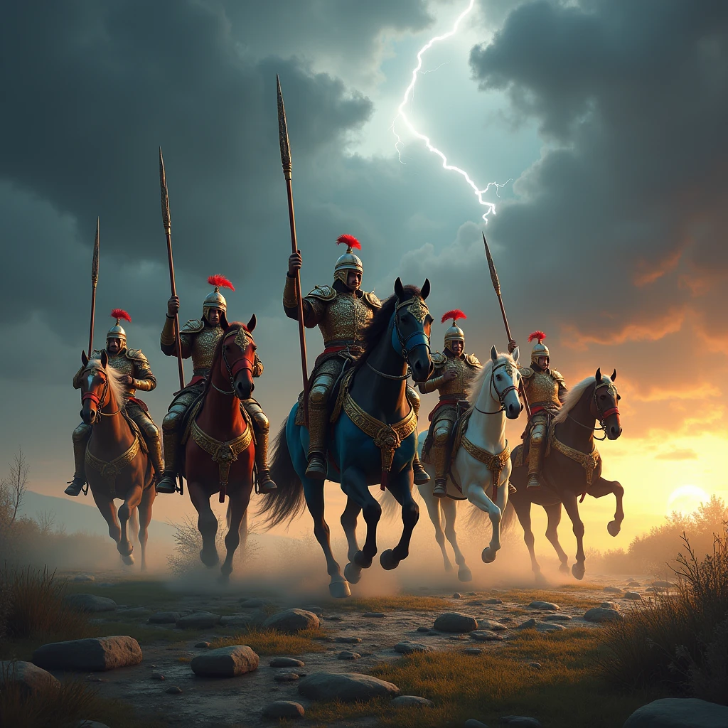 This is a highly detailed digital artwork depicting five warriors riding majestic horses through a dramatic, stormy landscape. The warriors are clad in elaborate, ornate armor with intricate designs and gold accents. Each warrior is armed with a spear or lance, held aloft as they gallop towards the viewer. The horses are equally impressive, each adorned with regal, colorful harnesses that match the warriors' armor. The colors of the horses include red, blue, green, white, and brown, adding a vibrant contrast to the dark, moody background. The background is dominated by a tumultuous sky filled with dark, swirling clouds, punctuated by a brilliant bolt of lightning that illuminates the scene. The horizon is bathed in the warm, golden light of the setting sun, creating a dramatic contrast with the stormy atmosphere above. The ground is rugged and rocky, with patches of grass and small stones scattered about. The overall mood is intense and epic, suggesting a battle or quest underway. The image combines elements of fantasy and realism, with the attention to detail and texture making it appear lifelike. The composition and lighting enhance the sense of motion and urgency, drawing the viewer into the dynamic scene.