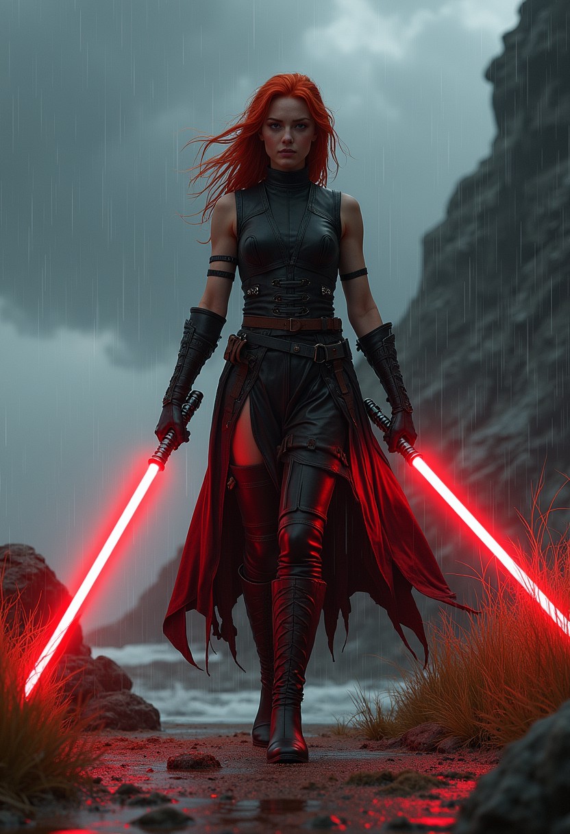 a centered below shot high detailed digital art illustration of a Sith knight in a walking pose holding 2 red light-sabers, wearing a black leather Sith tunic dripping with no sleeves and bare-arms, looking at viewer with manic smile, wild red hair, young girl, black gloves. volumetric light from above, rim lighting, the background is a foreign planet with rocky shore, high grass in the wind, rain, storm, rainy day with dark clouds