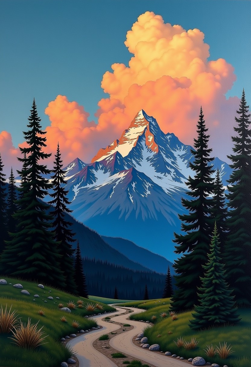 painting by sargent and rhads and leyendecker and greg hildebrandt evening sky, low thunder clouds foothpath with trees at indian summer with zugspitze fitz roy in background, colours green, red, blue black and white, acuarela