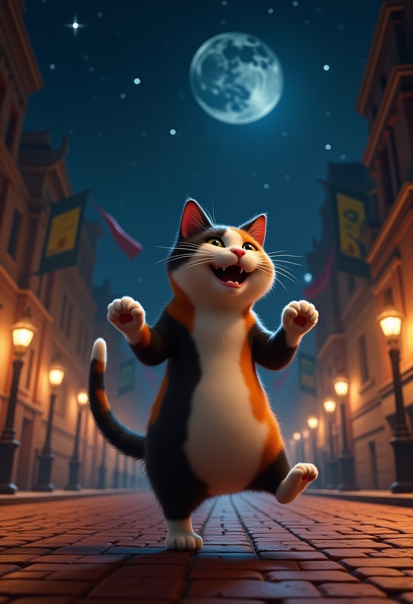 A joyful, plump calico cat with distinct orange, black, and white patches is dancing merrily through the streets of Columbia from BioShock Infinite. The cat is prancing on its hind legs with a blissful expression, radiating happiness. The background shows the floating city of Columbia with its classical architecture, colorful banners, brick roads, and skyward structures. The scene is set at night, with glowing streetlights, a dark sky filled with stars, a bright moon, and other celestial elements. The night sky is enhanced with more stars and a more prominent moon, adding to the magical, illuminated atmosphere.