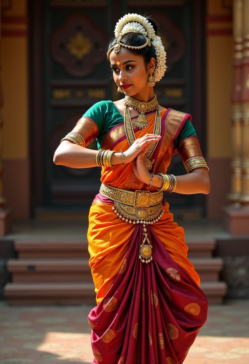 A classical Indian dancer in a richly decorated costume performs a Bharatanatyam dance. Intricate jewelry, expressive mudras, vibrant saree, temple backdrop, ankle bells jingling, poised expression, cultural patterns, extreme close-up, portrait, colorful, graceful light.