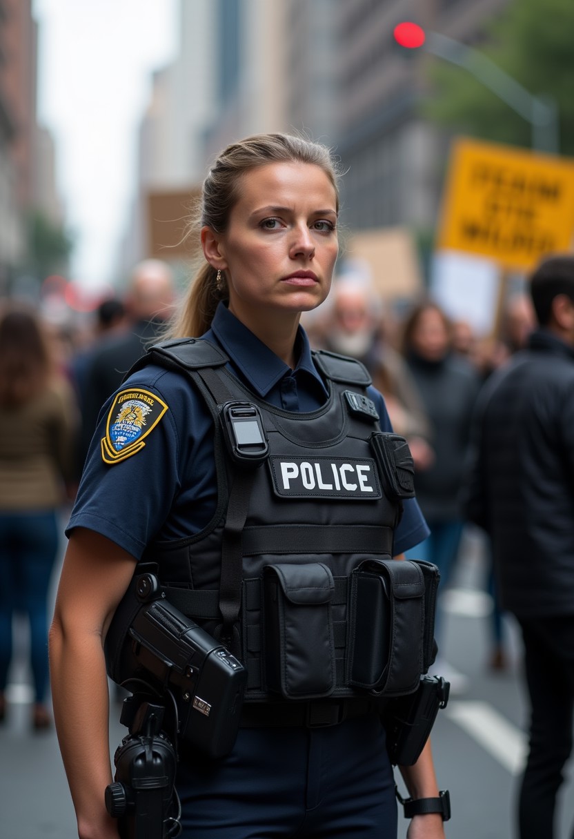 A vigilant female police officer stands guard during a city protest. Protective vest, badge, firm stance, urban backdrop, diverse crowd, determined expression, radio at her side, signs and banners, extreme close-up, portrait, resolute, urban light.