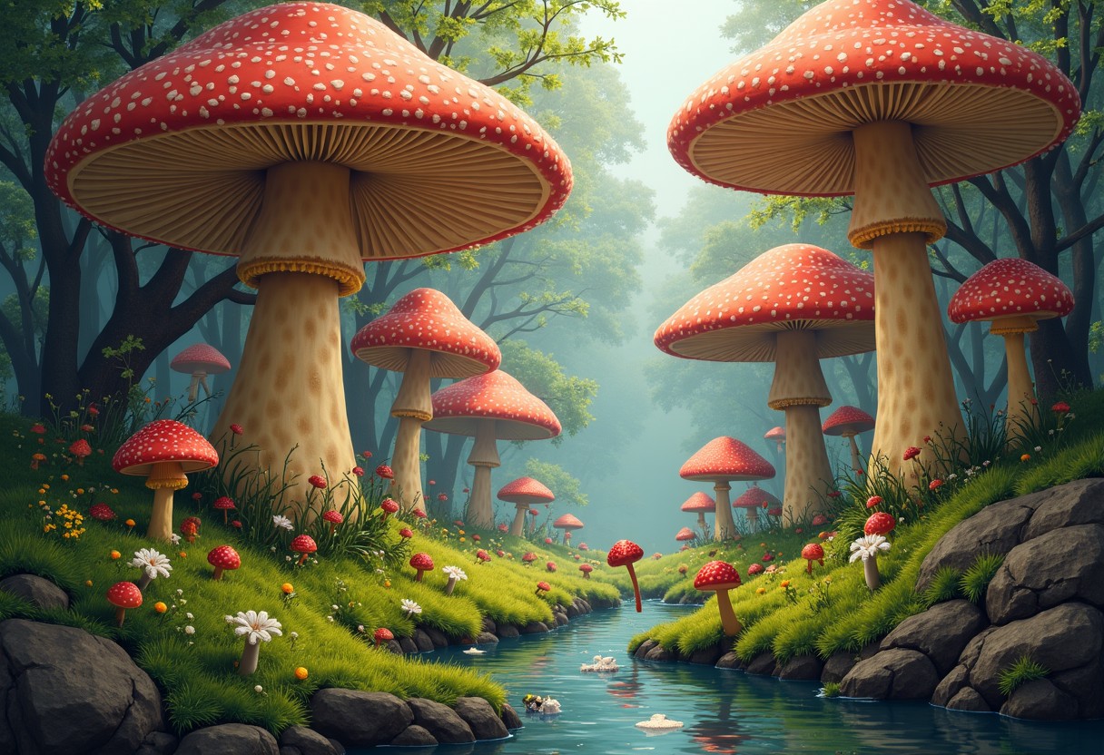 A forest dominated by mushrooms. Under the giant mushrooms there are small animals, grass, and ponds.