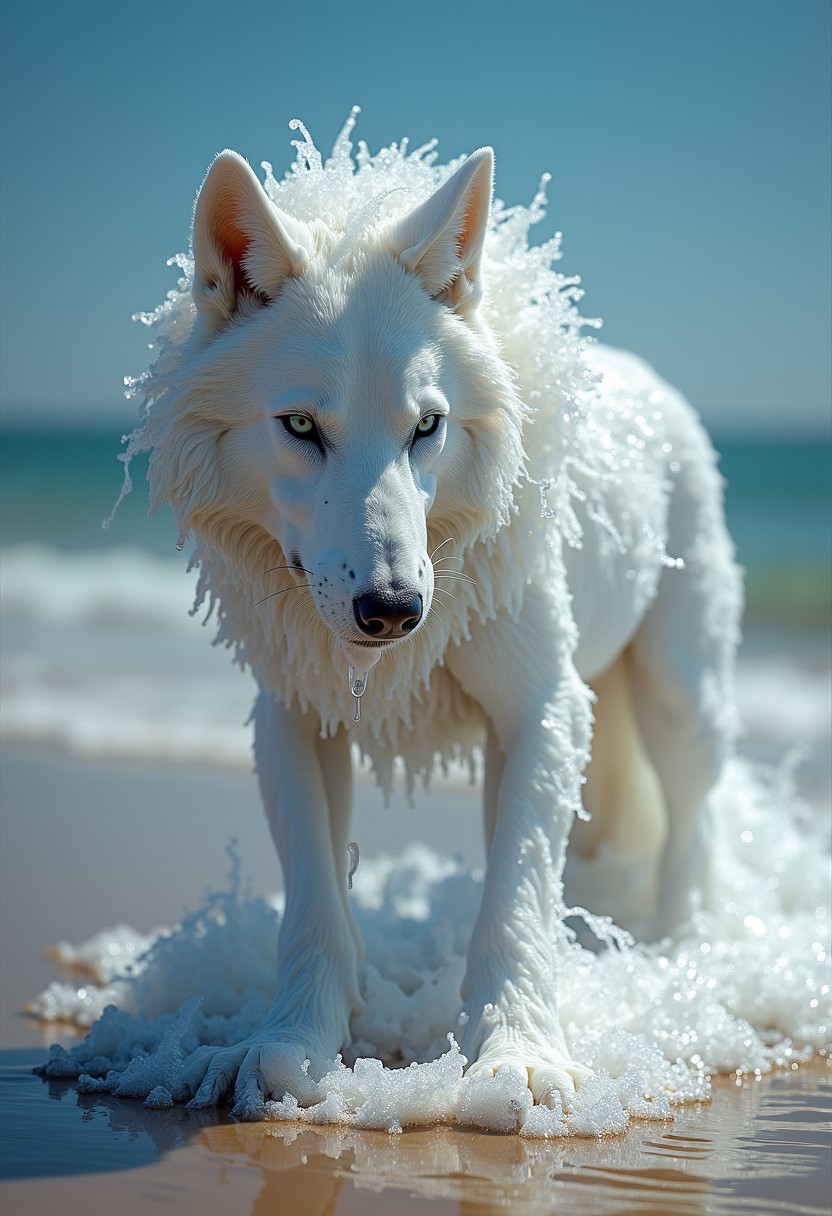 A full shot of a (liquid water wolf:1.3), wolf shape, foam, splash, drip, vapor, warped, deformed, translucent, ultra detailed, photo, Canon M50, 200mm, beach background