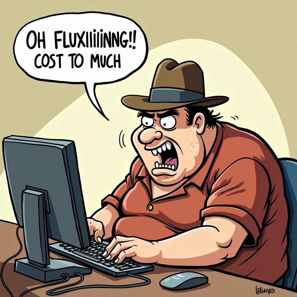 Cartoon of an overweight man wearing a fedora, hunched over a computer keyboard typing furiously. The man is sweating and has a crazed, frantic expression on his face. His mouth is open. A speech bubble coming from the man reads "OH FLUXIIINNNG!!! Cost to much buzz"