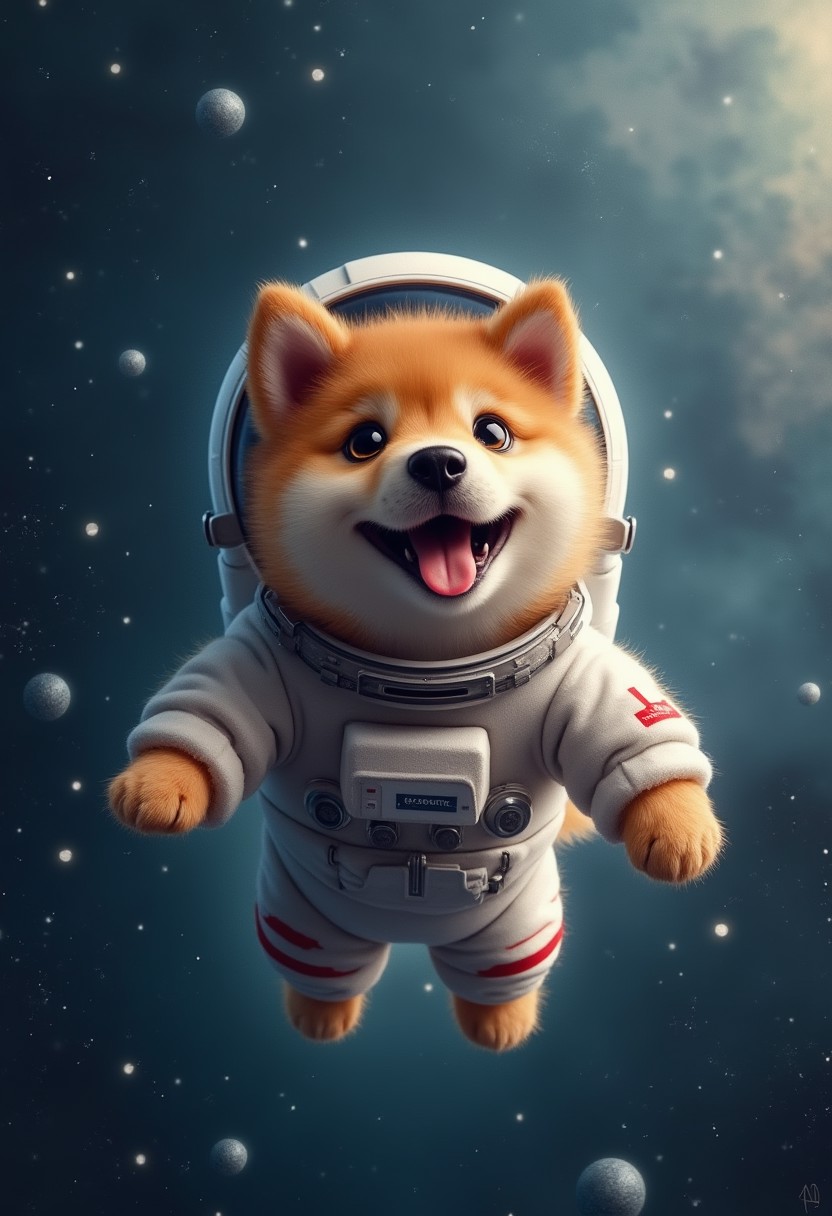 A magnificently detailed realistic photograph of an happy puppy Shiba Inu Astronaut looking at viewer, floats gracefully amidst the vast expanse of deep space. mouth open with tongue out, smiling, looking at viewer, (really fluffy, long fur, fur, Soft, Fuzzy, Woolly, Plump, Cuddly:1.5)