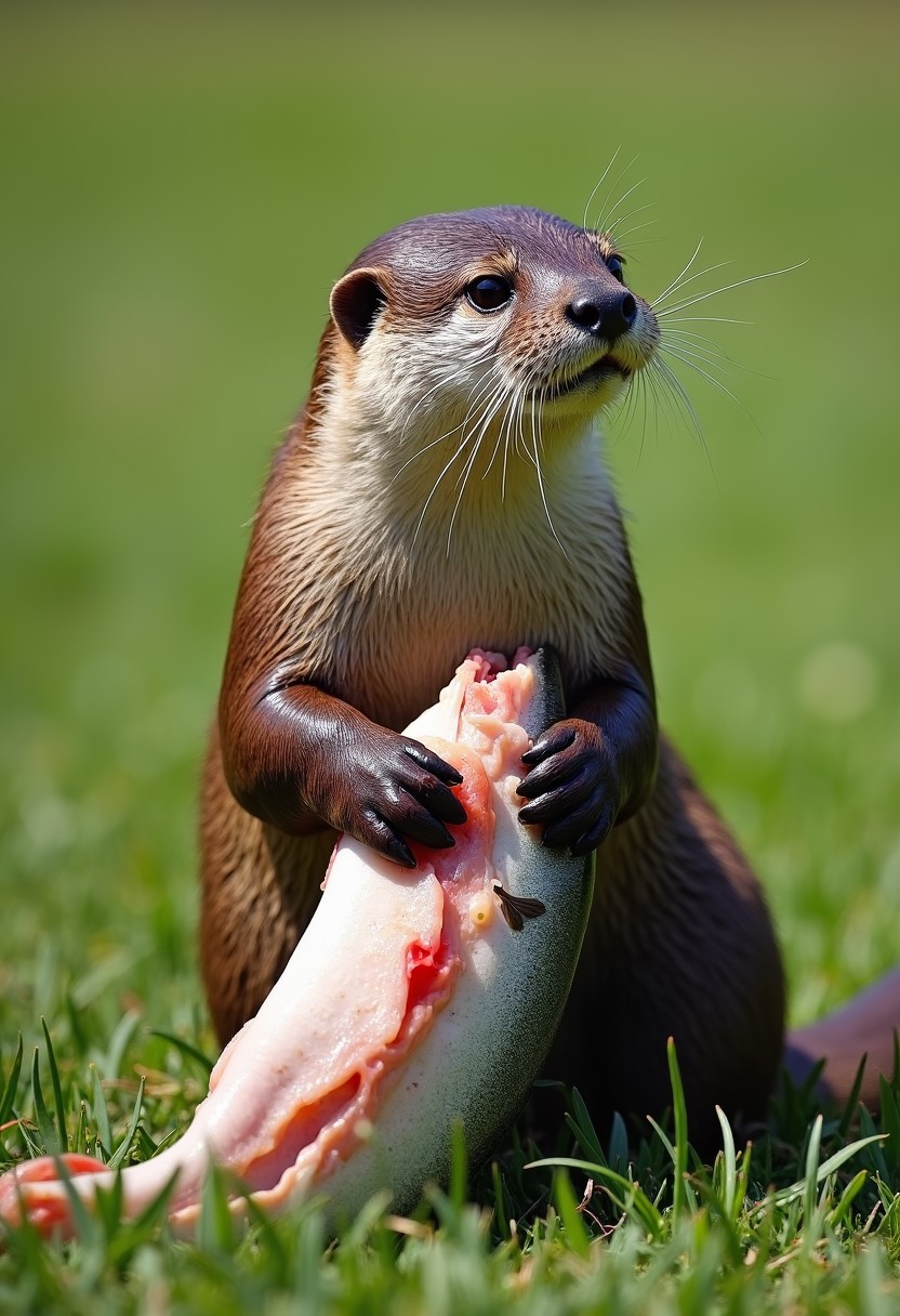 An otter is on a grassy field, its (brown, wet fur) clinging to its body, indicating it has just come ashore. Its front paws are gripping the carcass of a fish, with (vividly exposed fish flesh) and bones revealing the aftermath of its hunt. The otter's gaze is alert, looking off to the side as if monitoring its surroundings for potential threats. The background is a (vibrant green grass field), and (natural light) illuminates the entire scene, adding a touch of wildness to the atmosphere. This moment captures the otter's instinct as a predator and the harsh survival rules of the natural world.