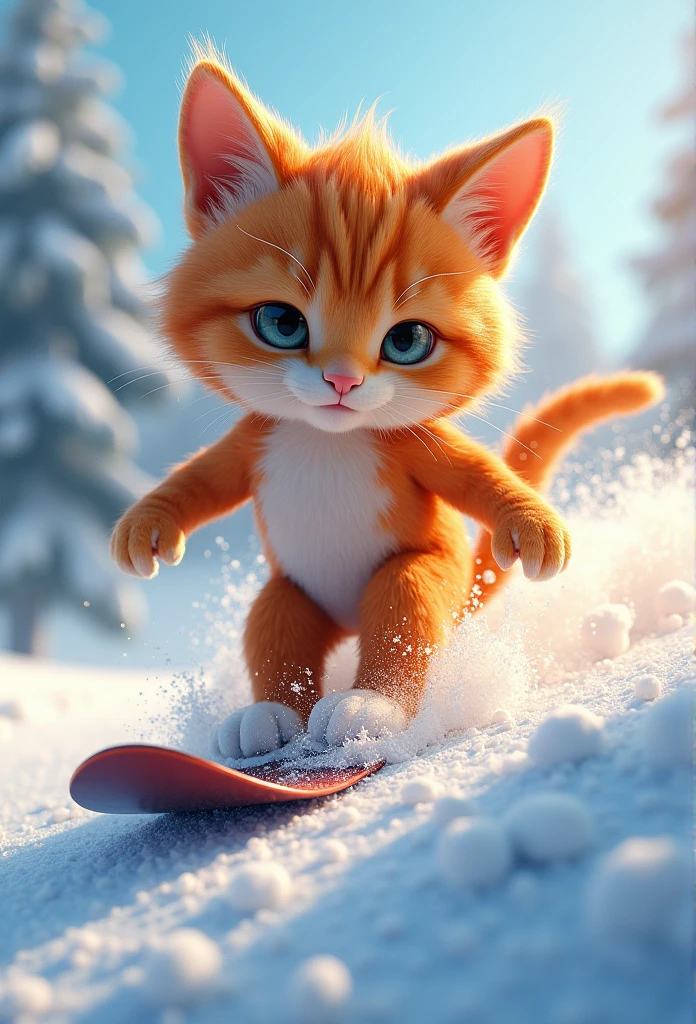 ginger cat skiing on snowboard,without clothes, naked, snow explosion, action shot, nude, sunlight, wide angle, ultra detailed, realistic 3d render