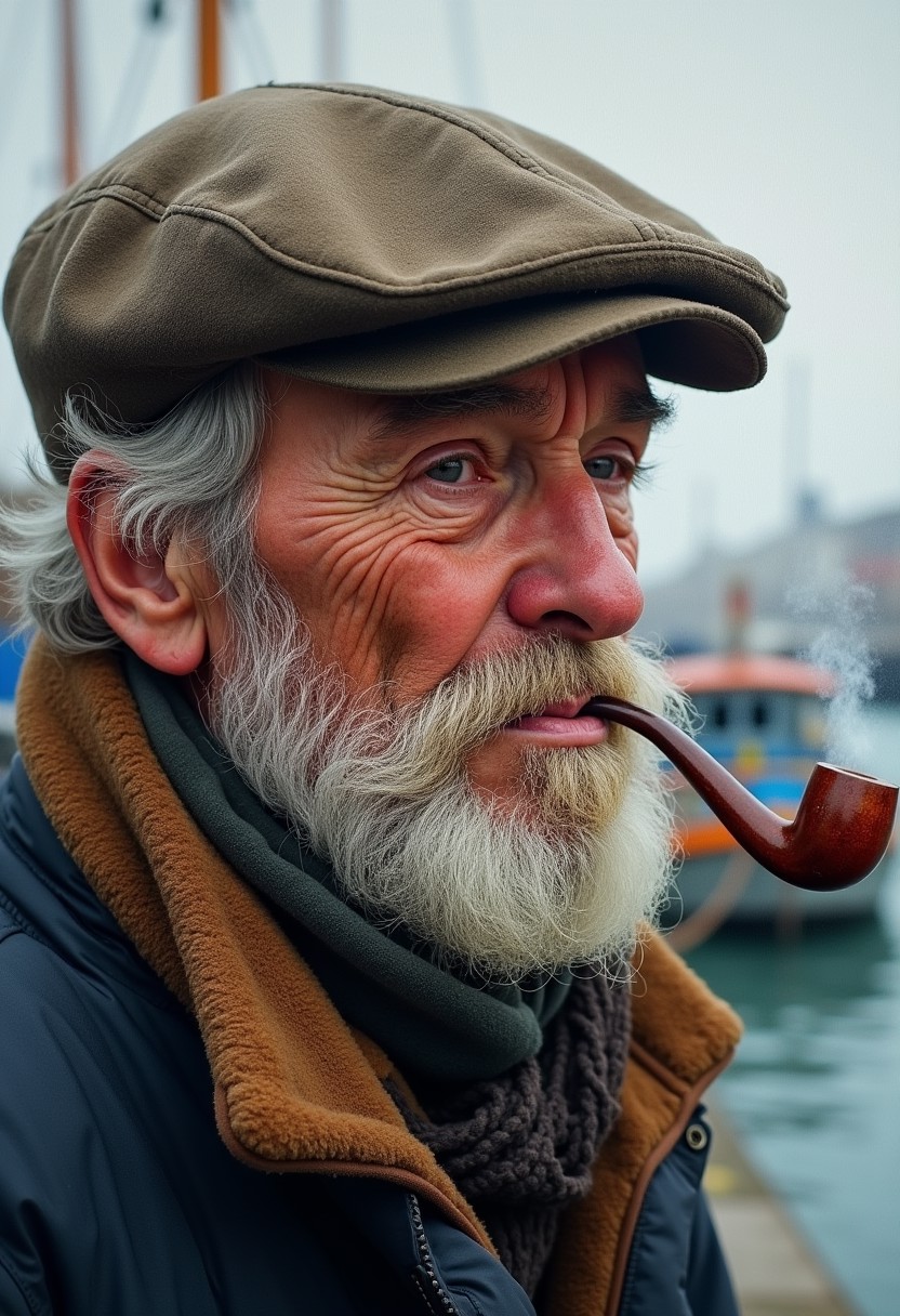 an old fisherman with a weathered face smoking a pipe on the quayside painting, extreme close up, portrait,