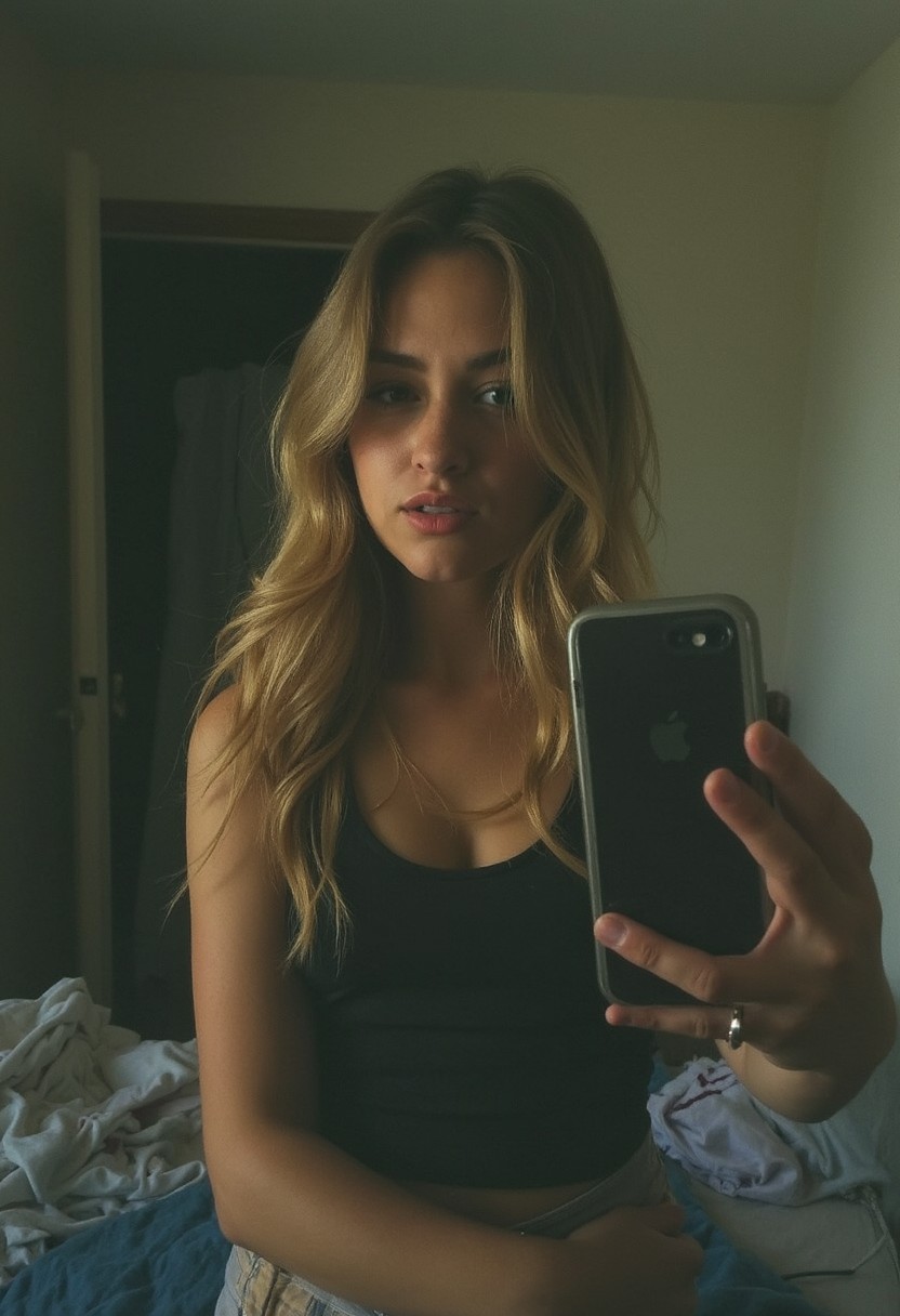 Phone photo: A woman stands in front of a mirror, capturing a selfie. The image quality is grainy, with a slight blur softening the details. The lighting is dim, casting shadows that obscure her features. The room is cluttered, with clothes strewn across the bed and an unmade blanket. Her expression is casual, full of concentration, while the old iPhone struggles to focus, giving the photo an authentic, unpolished feel. The mirror shows smudges and fingerprints, adding to the raw, everyday atmosphere of the scene.