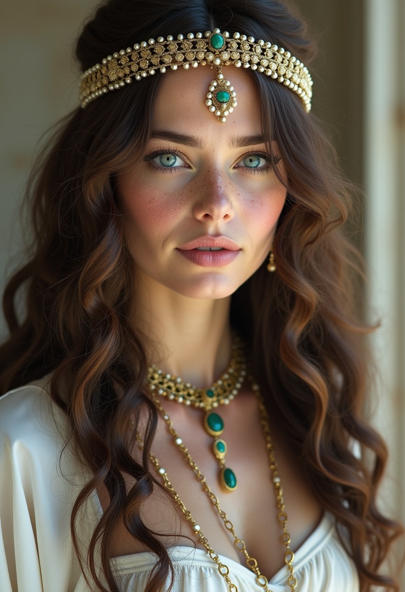 Extreme closeup upper body portrait, gold filigree, 25 year old druidic priestess oracle, greek woman with long curled hair, adorned with white silk, pearls and jade, circlet, standing in byzantine white marble temple, by Brian Froud and Heather Theurer, extremely detailed head and freckled face, skin pores, parted lips, very realistic and symmetrical eyes, large glowing blue eyes, enchanting eyes, (eye contact with viewer), hyper detailed, hyper quality, artstation award winner, Epic realism, meticulous masterpiece, film grain,