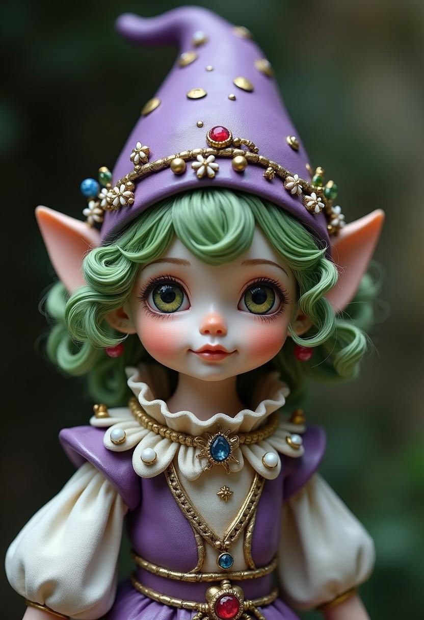 A porcelain gnome doll,boy,male,court jester,outfit,gems and flowers,beautiful,natural beauty,light purple skin,green hair,warm color palette,