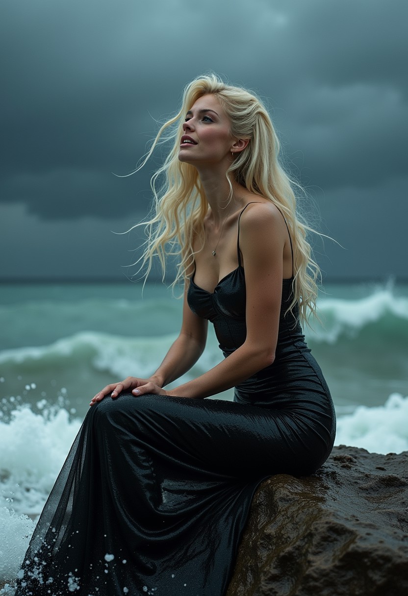A mysterious blonde siren sits on a rock at the edge of a stormy sea, her hauntingly beautiful voice echoing across the waves. Her hair, a cascade of pale gold, flows in the wind, mingling with the salty spray of the ocean. She wears a sleek, black gown made of shimmering, wet fabric that clings to her slender body, contrasting with her fair skin. Her eyes, a deep and mesmerizing blue, hold an intense gaze as she sings, her full lips slightly parted in a seductive smile. The storm clouds gather overhead, casting dark shadows across the churning sea, while flashes of lightning illuminate her striking figure. The atmosphere is charged with danger and allure, with the siren exuding an irresistible, deadly charm that lures sailors to their doom.