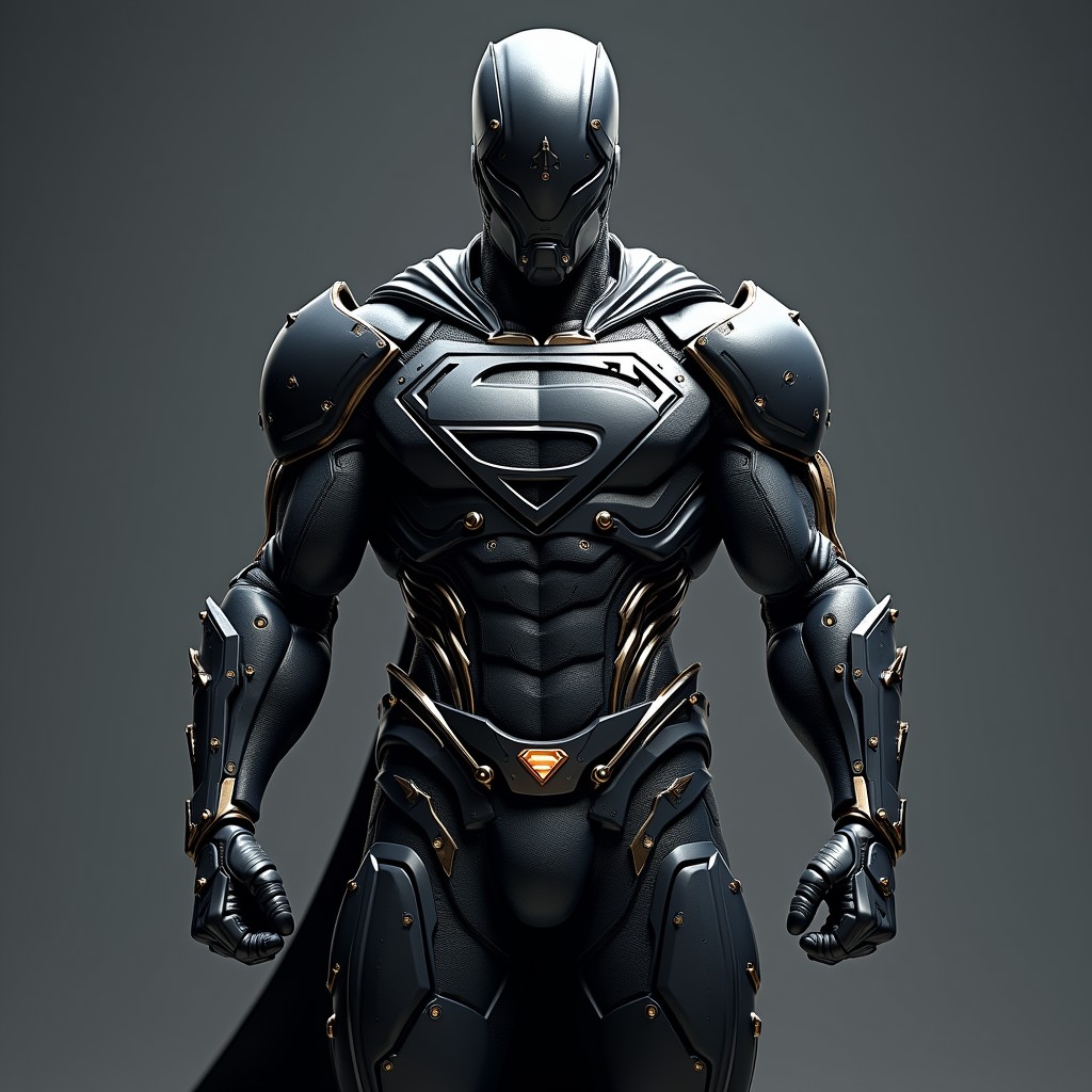 Create a hyper-realistic, 8k. The character should be a male with a full head helmet and no hair, featuring a modern, intricately designed suit with advanced technology and dark colors. Ensure the suit is highly detailed, with a strong, muscular appearance and complex armor that covers the body, showcasing lots of steel plating. Include prominent symbols in the middle of the chest. The design should emphasize a powerful and formidable look, avoiding round shapes, and embodying high detail and master craftsmanship. in a masterpiece depiction with enhanced technological gear and armor, flexible, flying with sword, superman flying through intergalactic space by Craig Mullins, ilya kuvshinov, krenz cushart, artgerm trending on artstation by Edward Hopper and Dan Mumford and WLOP and Rutkovsky, Unreal Engine 5, Lumen, superman