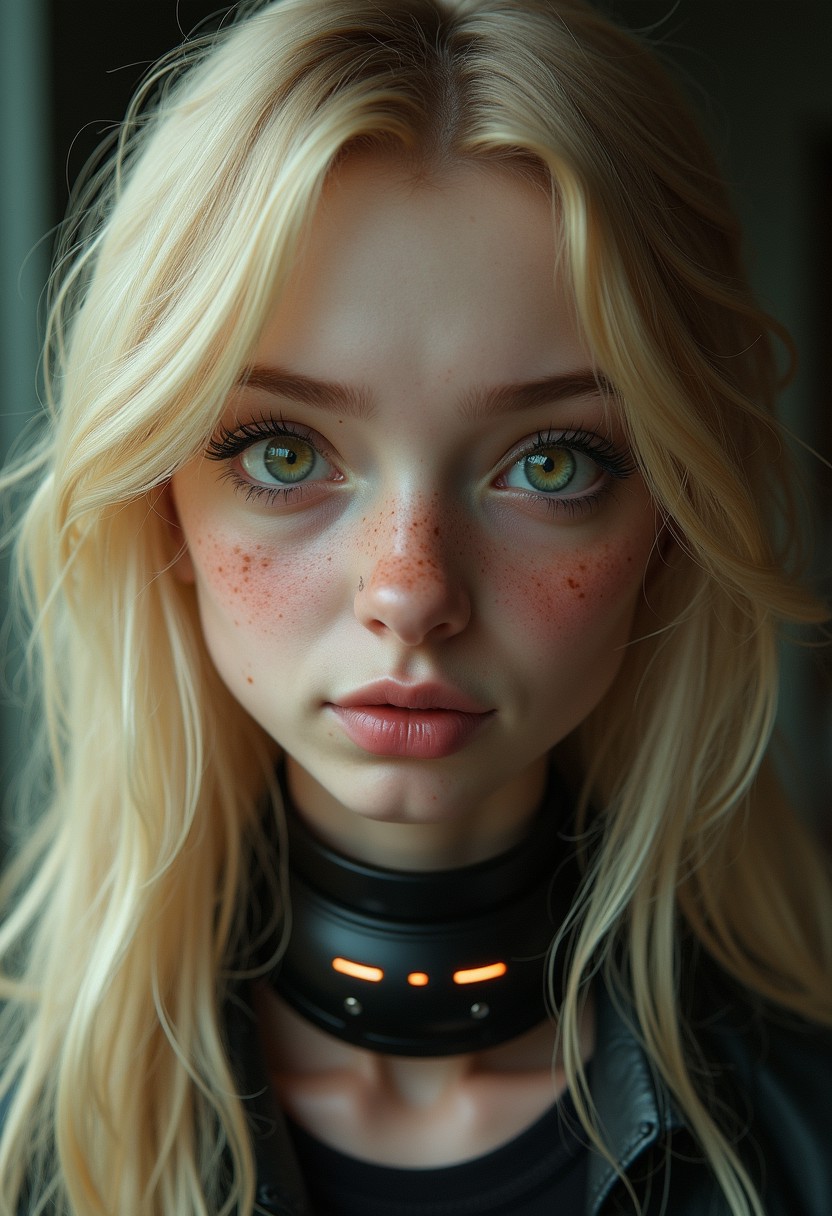 (ultra realistic,32k, ultra sharp,masterpiece:1.2),(high detailed skin:1.1),( high quality:1.1),(ultra high res:1.4), (beautiful lighting:1.4), (dynamic angle:1.6), 1girl, freckles, green eyes, blonde hair, long hair, goth, goth girl, sexy pose, big tits, nipples, naughty smirk, naughty, portrait, close up, (futuristic slave collar around neck with lights and display),