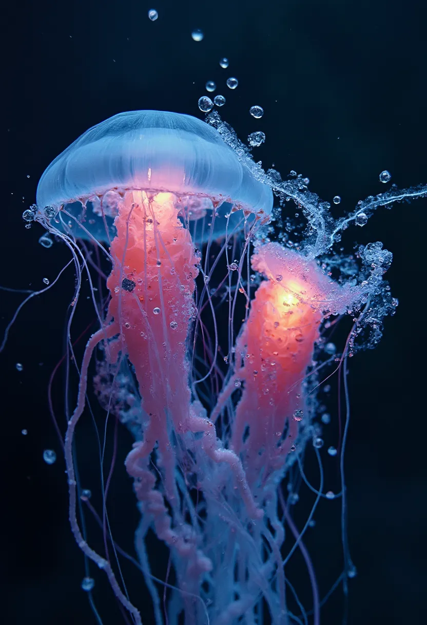Underwater macro photograph, crystal-clear water, vibrant colors, high contrast. Capture an intricate dance between a translucent jellyfish and a bioluminescent deep-sea creature. The jellyfish's delicate tendrils intertwine with the glowing appendages of its partner, creating a mesmerizing light show against the inky black background. Tiny air bubbles rise around them, catching and refracting the ethereal light. The scene should evoke a sense of wonder and alien beauty, with every minute detail of the creatures' anatomy visible in stunning clarity.