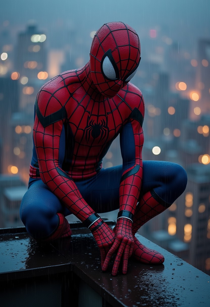 spider-man, vemon costume, rain, night, detailed costume, Rooftop, seating on edge