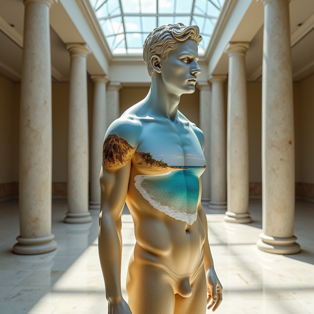Imagine a hyper-realistic photograph of a striking sculpture displayed in a grand museum. The sculpture, a full-body representation of a man, is unlike any other—it features a mesmerizing beach landscape as its “skin.” The man’s form is impeccably crafted, showcasing a blend of classical and modern artistry. His skin, however, is an intricately detailed beach scene, seamlessly integrated into his physique. The chest and arms exhibit a smooth, sunlit stretch of golden sand, with tiny grains rendered with meticulous precision. The torso transitions into a vibrant, azure sea, capturing the gentle waves that lap against the shore. The sculpture’s head is crowned with a beachscape of rolling dunes and sparse, wind-swept grass. As the sunlight from the museum’s skylights filters through, it highlights the contrast between the realistic texture of the sand and the flowing movement of the water. The man’s posture is relaxed and contemplative, embodying the tranquility of the beach. Around the sculpture, the museum’s pristine, marble floors reflect the serene scene, while the surrounding walls provide a clean, modern backdrop. The soft, ambient light accentuates the details of the sculpture’s unique beach landscape, drawing the viewer into a serene daydream where art and nature merge harmoniously. The overall atmosphere is one of calm and introspection, inviting visitors to pause and contemplate the interplay between the human form and the natural world