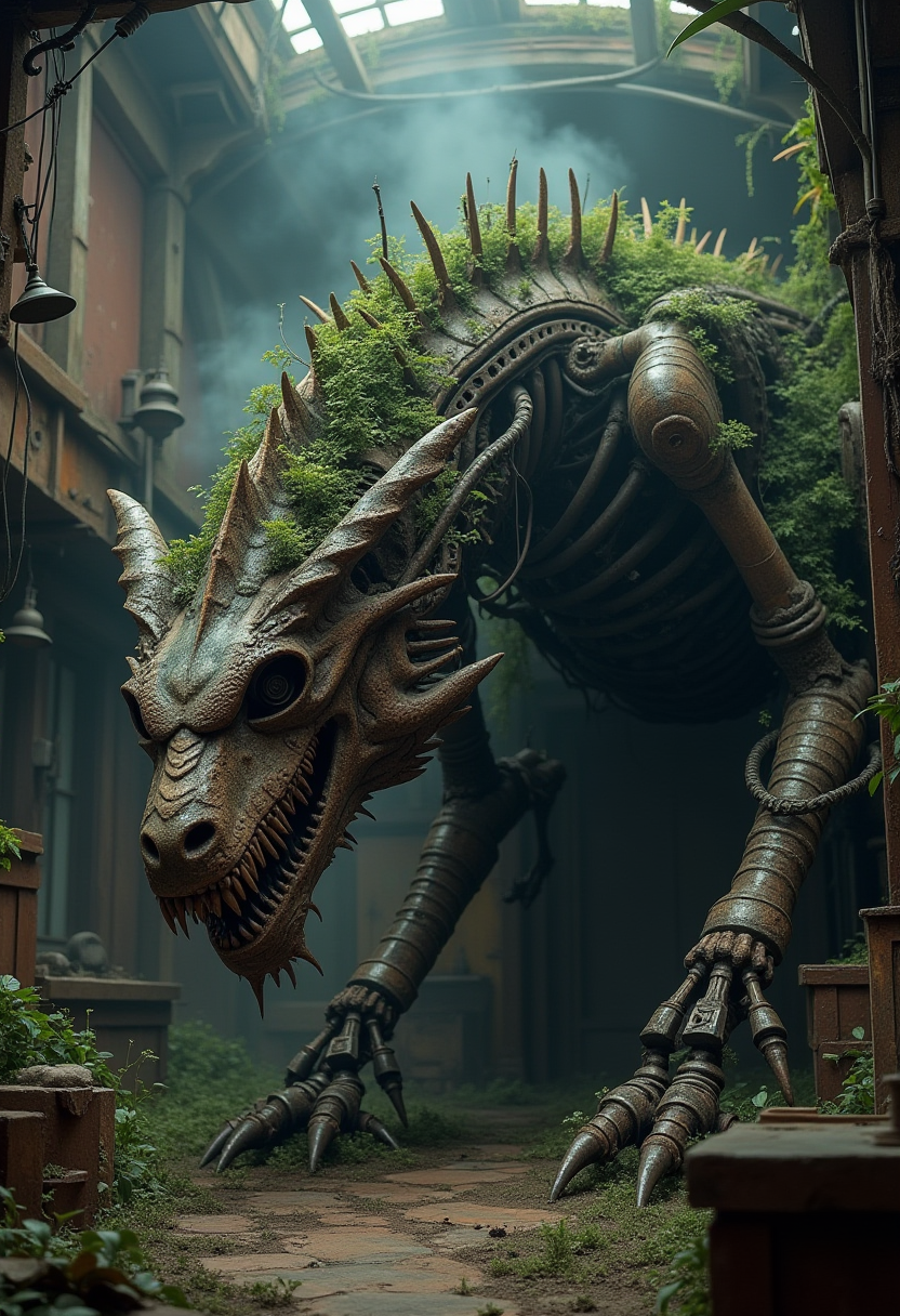 The Victorian-era mechanical dragon lies dormant in a dilapidated workshop, its massive skeletal frame nearly consumed by overgrown vines and the ravages of time. The once-majestic creature is now nothing more than a twisted hulk of rusted metal, with frayed clockwork wires and broken gears visible beneath its cracked, scale-like skin. The air is thick with smoke, and the faint glow of flickering sparks adds to the eerie atmosphere, casting an otherworldly light upon the scene. The workshop itself is adorned with ornate, detailed machinery and decorative elements, highlighting the era's fascination with industrial innovation and artistic expression.
