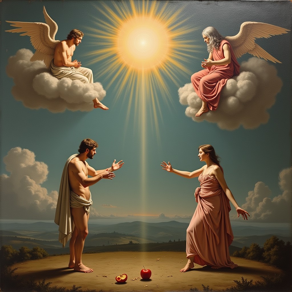 Painting of an epic scene, God expels Adam and Eve from heaven to earth, Michelangelo style painting, early renaissance painting, masterpiece, noticeable paint texture, muted colors, Sad angels look down on the earth from the clouds, sad gray-haired God sits on a cloud, a man and a woman walk alone on the earth in shame, one bitten apple lies on the ground