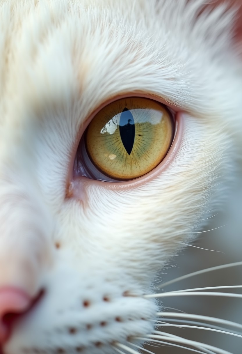 Extreme close-up half face of a white cat, direct frontal view. Detailed iris and pupil. Sharp focus on eye texture and color. Natural lighting to capture authentic eye shine and depth.