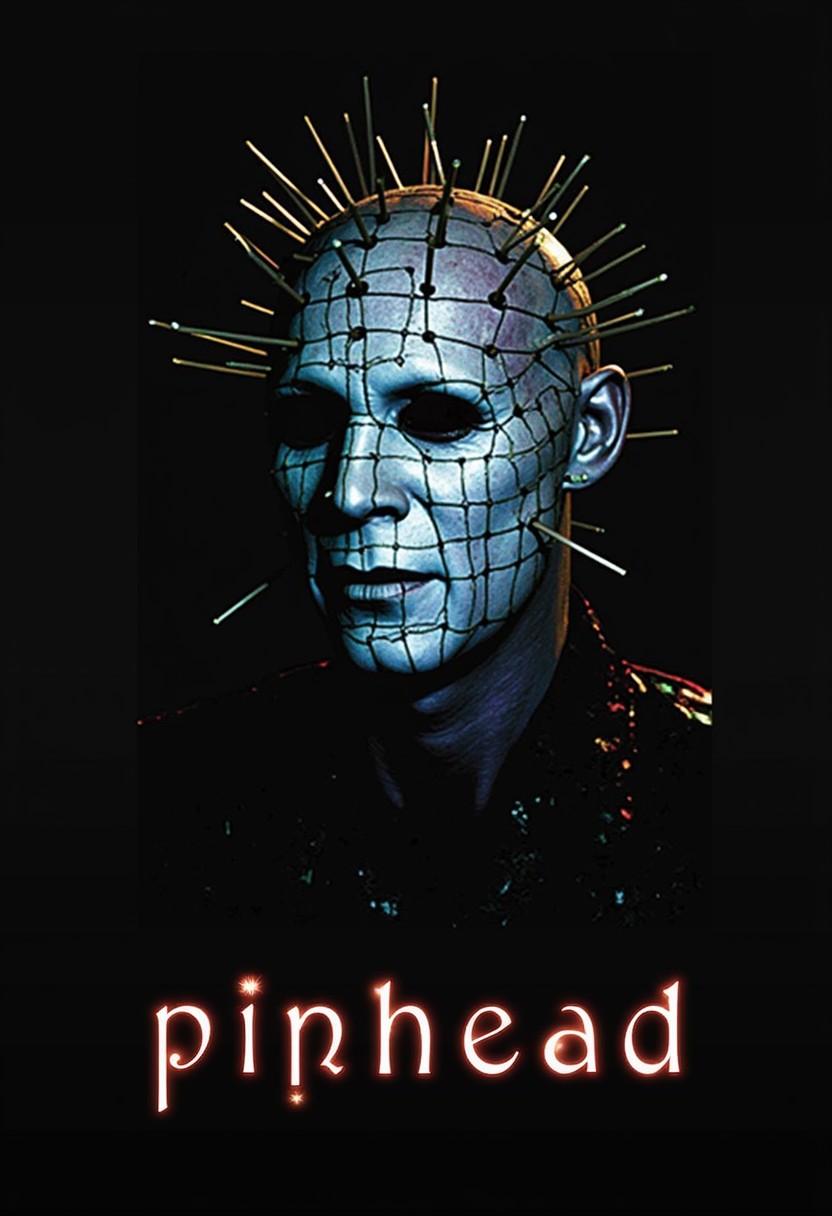 Pinhead from Hellraiser, dark background, soft colorful lights reflecting on his wet skin, looking off into the distance with blank eyes, from below and to the side. The smoothe words "Pinhead" are bolded below the image