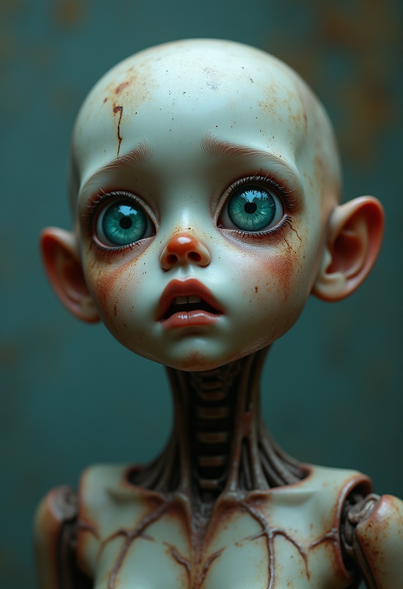 This happens without knowing the truth You sculpted the body, put it on the line Love, which did not want this Stay with you and flew away Where no one ever suffers To those who will never know Love made of plastic, unknown race Love is the color of pain, She moaned and screamed so much that I felt it in my body. Full length view. Little funny robot, porcelain face and head, big turquoise eyes, beautiful eyes, Best quality, relief, dark gothic, conceptual art, Psychedelic, post-apocalyptic, sinister, oil painting, thin flowing lines. Long strokes, light delicate shadows, + 36.5 mm f0 cinematic quality, + Peter Elson style, Alexei Maleev, Ryohei Hase, Rafael Sanzio, Pino Daeni, Charlie Bowett, Albert Joseph Peno, Ray Caesar,