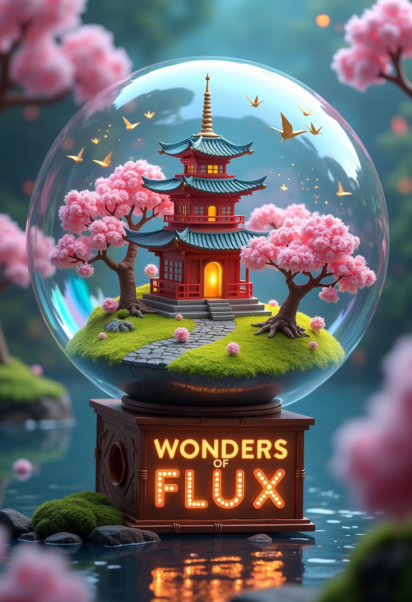 Step into a mesmerizing dreamscape where reality waltzes with imagination! At its core, a gigantic soap bubble shimmers with cascading iridescent rainbows. Within this ethereal sphere, a whimsical Japanese pagoda floats—its walls adorned with candy-striped silk and its roof a flurry of golden origami cranes taking flight. This fantastical pagoda perches precariously atop a floating island of neon-green grass, sparkling as if dusted with fairy magic. Enveloping it, cherry blossom trees burst with cotton candy blooms, their petals swirling in gentle pink tornadoes. Nearby, a mischievous bonsai tree, its leaves a kaleidoscope of ever-changing colors, grins playfully as firefly fairies dart among its branches. The bubble rests on an intricate contraption of polished copper and glowing gemstones, teetering on oversized, moss-covered blocks that spell out “WONDERS OF FLUX” in a whimsical, illuminated script. Surrounding this scene, a moat of liquid starlight ripples with leaping origami koi fish. Beyond, an enchanted forest unfolds with ice cream-flavored tree trunks and mushrooms large enough to dwell in. Shafts of prismatic light pierce the canopy, revealing mischievous cloud sheep frolicking in a sky that shifts from bubblegum pink to electric blue. The entire composition dazzles with a symphony of electric purples, lime greens, sunset oranges, and cerulean blues, creating a riot of color and whimsy.