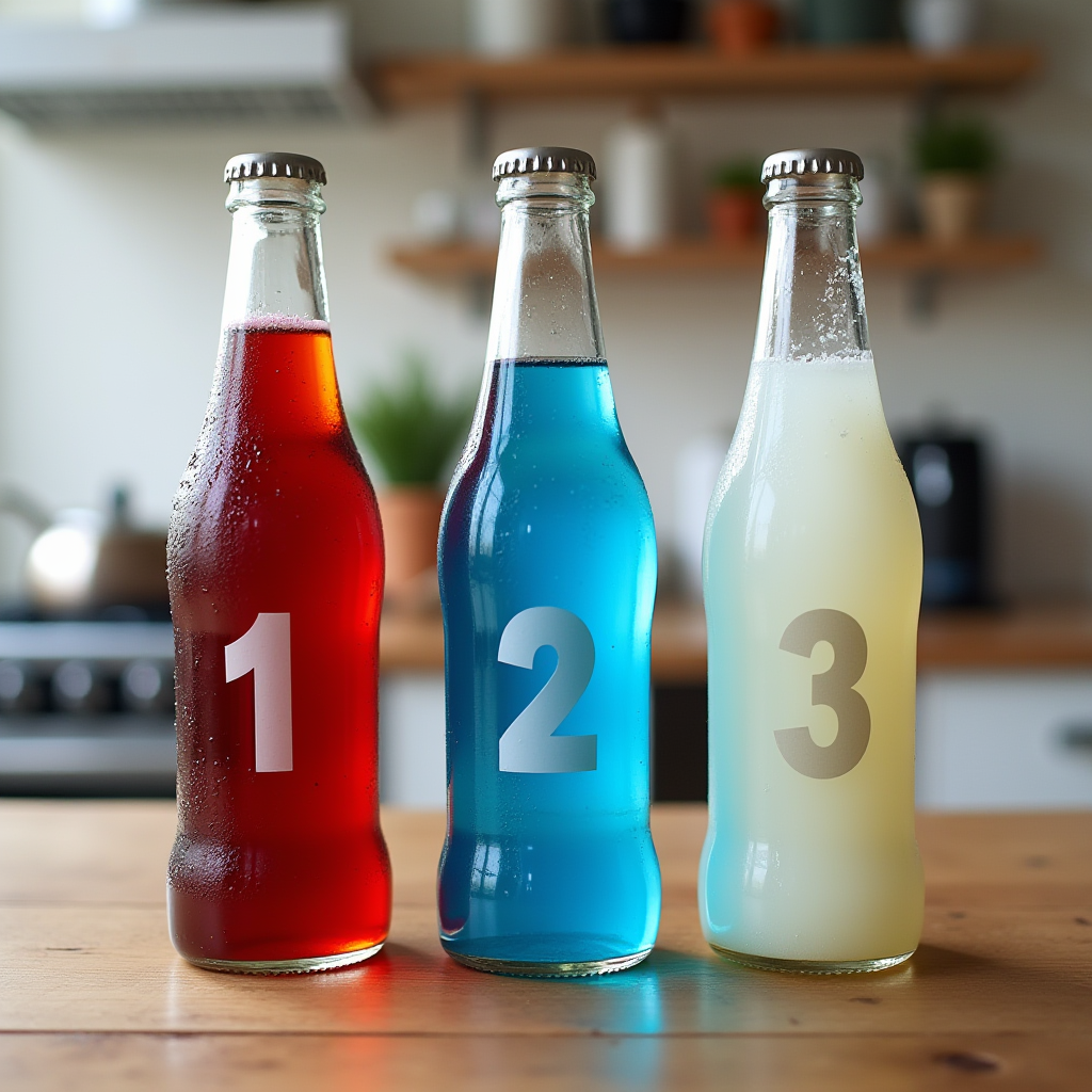Three bottles on a table in a kitchen. Bottles that look like cola. Left bottle is full of red liquid with the number 1 on it. Middle bottle is full of blue liquid with the number 2 on it. Right bottle is full of white liquid with the number 3 on it.