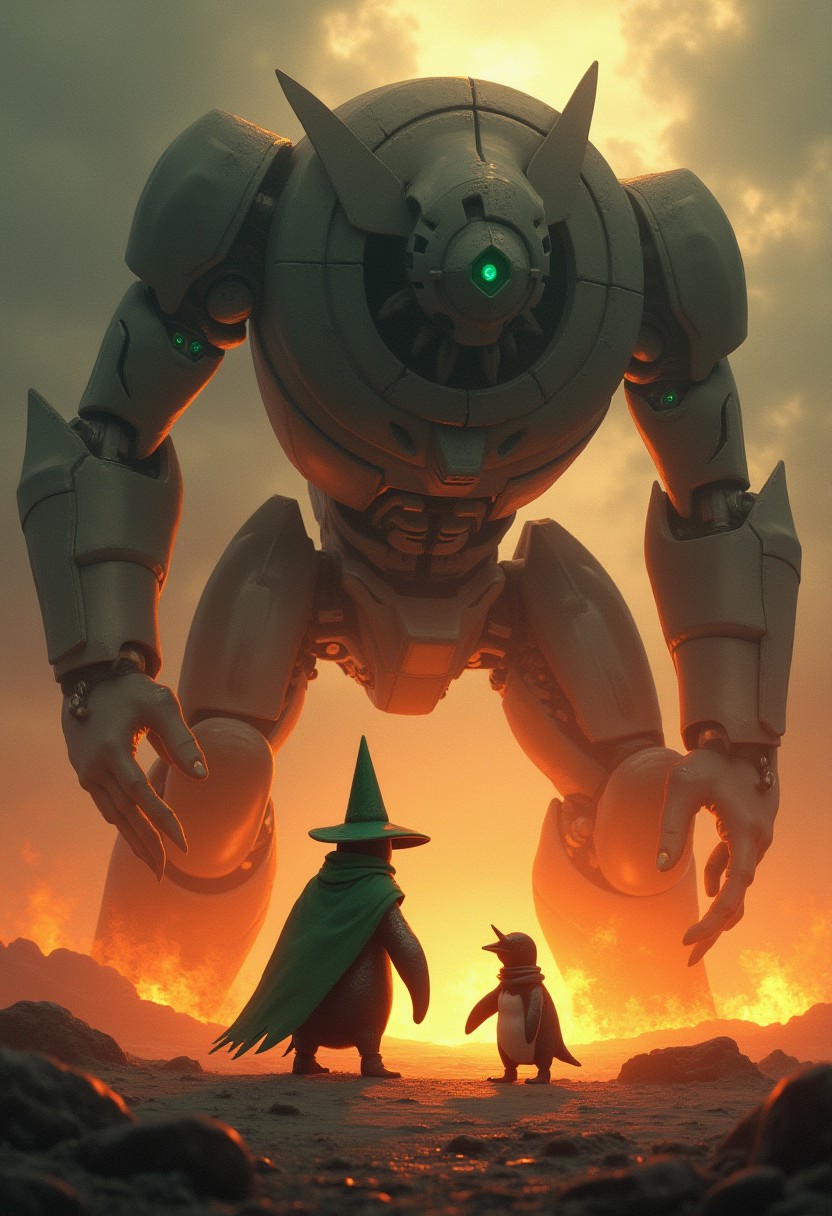 1 short penguin hero, 1 Giant Mech, "David and Goliath-type scene", small heroic Penguin facing a Giant Mech monster, small Penguin hero vs Giant Mechanical monster, penguin vs Mech, facedown, dramatic, Golden Ratio, The smell of sulfur fills the air as a fire spell is cast.,short Penguin wearing full body cape, edge quality,perspective silhouette,8k,best quality,masterpiece,extremely detailed,rule of thirds,photorealistic,superb,HDR,high resolution,sharp focus,photorealistic rendering,extremely detailed description, Penguin like hero wearing a cape and a green triangular & forward pointing pointy hat, humanoid like penguin hero,Extremely high detail, heroic penguin with a green Peter Pan hat,solo,(The ground trembles as the spell takes effect.:1.3),(Byakugan, from Naruto:1.2),(green sclera:1.2),(surprised:1.2),Grabbing own wing / Wing hold, Turquoise color scheme, Dramatic light, scenery, ink, mountains, fire, ragemode,mecha,destruction, caped hero penguin,so_monsters,infect