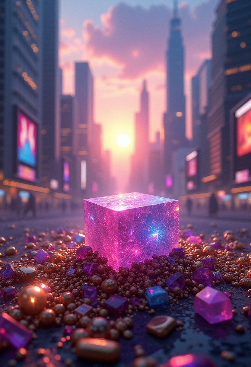 In this vibrant scene, the futuristic Indian metropolis dazzles with its towering skyscrapers and sprawling cityscape. The sharp edges of the buildings cast long shadows across the bustling streets, while the air is filled with a kaleidoscope of neon lasers. A solid cube of light illuminates the sky, creating a sense of wonder and awe. In the midst of this technological marvel, ancient treasures catch the eye. A pile of highly detailed crystal and gemstone relics, each facet reflecting the dazzling colors of the surroundings, sit amidst the modernity. Their timeless beauty contrasts sharply with the sleek, digital artworks displayed nearby on billboards and screens. Nestled among the crystals, gold relics gleam with a regal allure, their intricate patterns and designs speaking to a rich history. The sun, in its magic hour, casts an ethereal glow over the entire scene, creating a sense of otherworldly beauty. Each aspect of this artistic masterpiece is meticulously crafted, with an 8K level of detail that allows the viewer to lose themselves in the intricacies of the setting. The sharp focus and digital painting techniques used bring this incredible world to life, making it a stunning display of