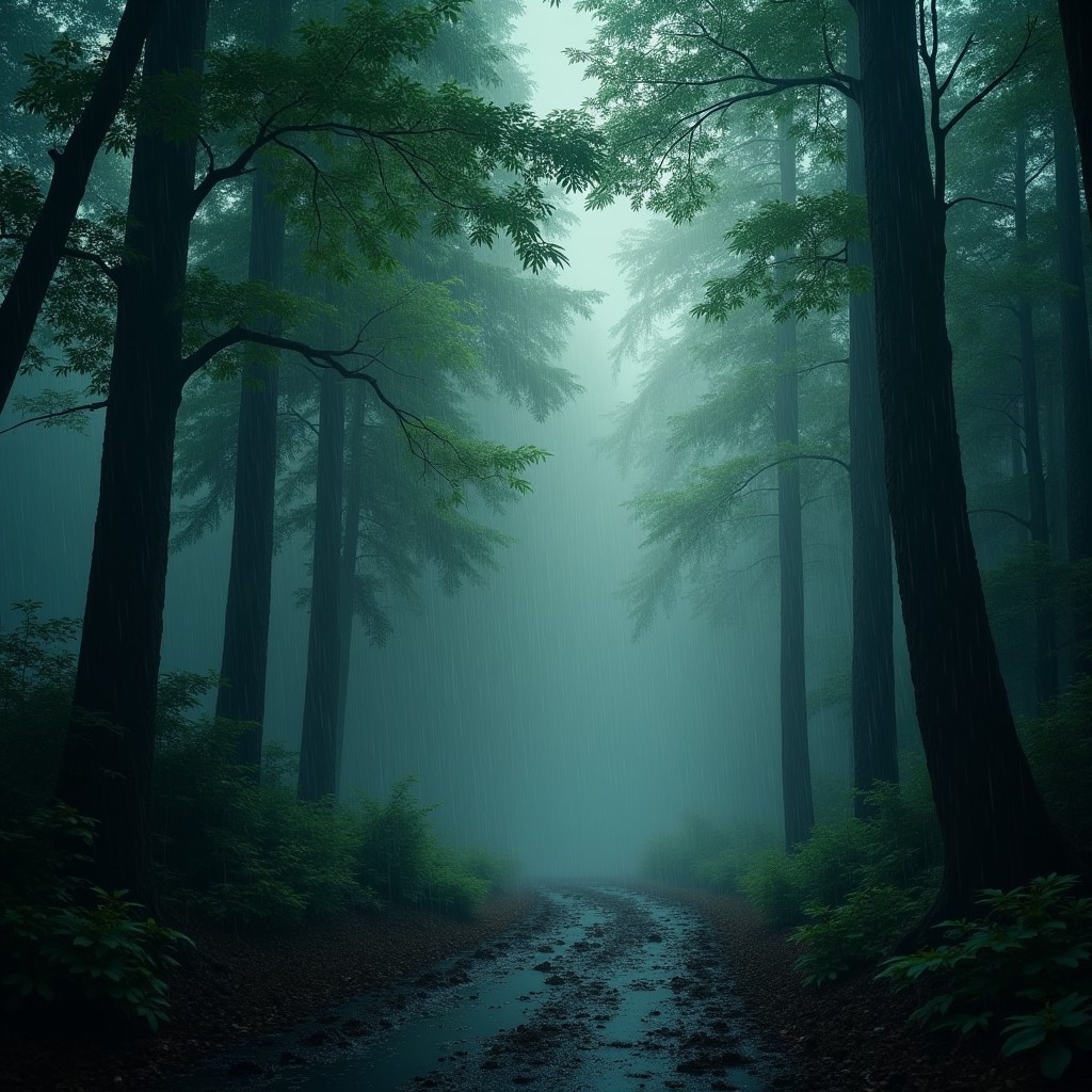 Create a stunning and atmospheric wallpaper featuring a dense, misty forest during a rainstorm at night. The scene should capture the forest in its full, lush glory, with tall trees draped in verdant foliage and a soft, diffused light filtering through the canopy. Rain should be falling steadily, creating a delicate curtain of droplets that adds texture and depth to the scene. The forest floor should be damp and covered with fallen leaves, while puddles reflect the dim, ambient light. The overall mood should be tranquil and contemplative, with the rain enhancing the sense of solitude and natural beauty. Aim for a rich, immersive color palette that combines deep greens, soft grays, and subtle blues, creating a peaceful and enchanting atmosphere