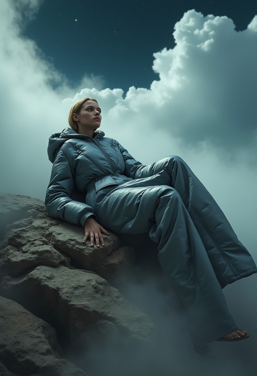 Fashion photography scene: A surreal, otherworldly setting featuring a skinny female model with a strong, ethereal presence. The scene is set against a dramatic backdrop of swirling clouds and a starlit night sky. The model is dressed in oversized, futuristic outerwear with a quilted texture and metallic sheen. Her pose is relaxed yet powerful, reclining on a rocky terrain that seems to float among the clouds. She gazes off into the distance with an air of mystery and contemplation. The lighting is soft, casting a subtle glow on her skin, while the clouds and mist around her add depth and dimension to the image. The overall mood is dreamlike, blending elements of fantasy and high fashion, creating a striking visual narrative that feels both grounded and otherworldly.