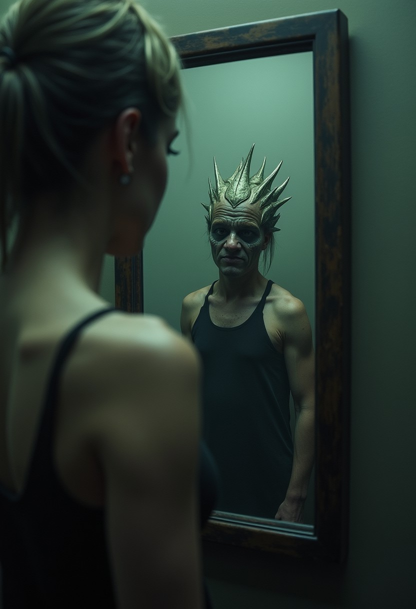 When I look in the mirror I see a horrific creature. A being full of hatred and sorrow. I feel lost inside my reflection. Cinematic still.