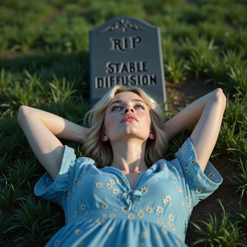 ultra realistic photo of adult woman with blondeish hair and blue eyes wearing a blue dress with small flowers motive, lying down on grass with hands behind head, (she is below a headstone that says "RIP Stable Diffusion":1.3), natural sunlight lightining, depth of field, bloom, cinematic style,headstone fully visible