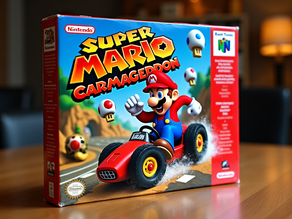 photograph of a nintendo 64 game box on a table the title reads Super Mario Carmageddon, crazy psychopath mario violently running over goombas in a death car