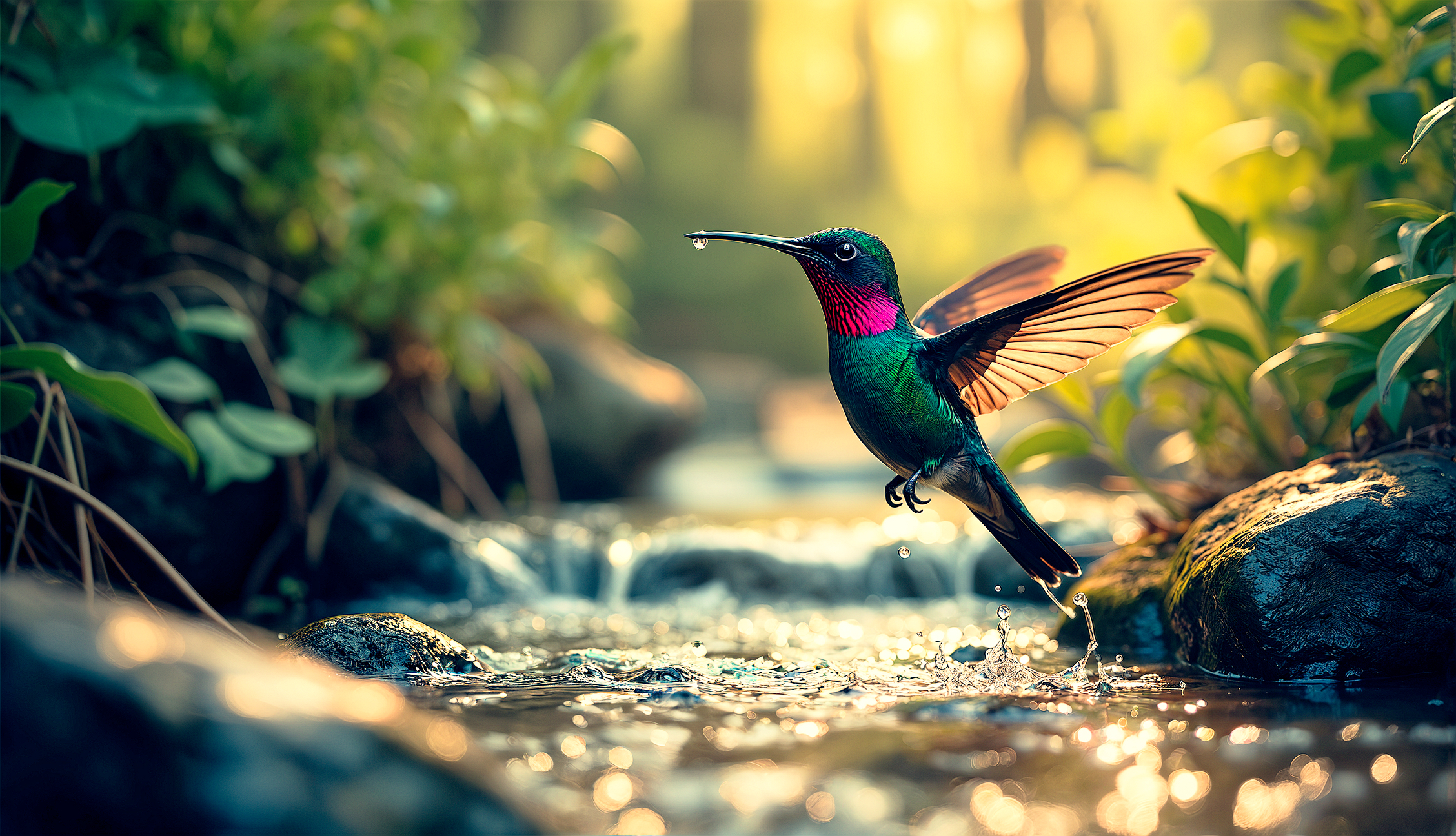 A vibrant, close-up photograph of a graceful hummingbird hovering near a crystal-clear brook, captured with a high-speed camera, ultra-sharp focus, and excellent depth of field. The hummingbird's iridescent feathers glisten in the soft, dappled sunlight filtering through lush foliage. The brook's water sparkles and reflects the surrounding greenery, creating a dynamic background. The composition follows the rule of thirds, with the hummingbird positioned slightly off-center and its beak pointing towards the flowing water. Rich, saturated colors emphasize the bird's jewel-like plumage and the lush forest setting. Bokeh effect in the background adds depth and softness to the scene. The image has a cinematic quality with a slight vignette effect to draw focus to the central subject. Photorealistic details capture the texture of feathers, the mist from the brook, and individual water droplets suspended in mid-air. The lighting is warm and natural, enhancing the bird's colors and creating subtle shadows. The overall mood is serene and awe-inspiring, showcasing the beauty of nature in perfect harmony. Shot with a professional DSLR camera, using a macro lens for intricate details, 8K resolution, high dynamic range, award-winning nature photography.
