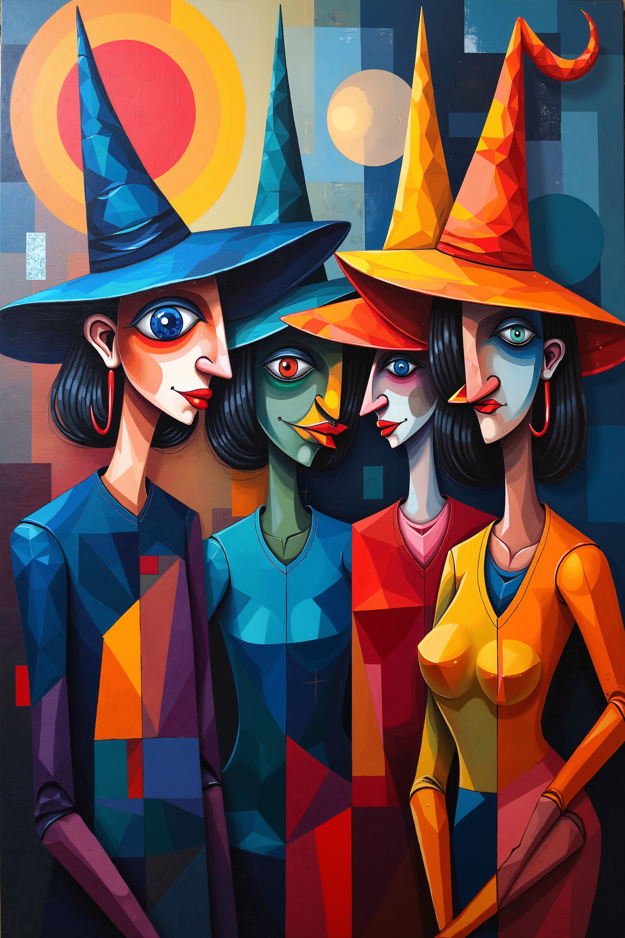 a vibrant canvas filled with geometric shapes and abstract forms depicts the chaotic chaos of an artist's creation. The colors are bold and dynamic, with hues that dance in harmony with each other. A group of cubist figures, witch hated in futuristic witch hats,