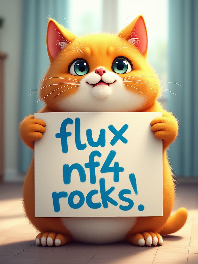 candid, render, cute fat cat holding a sign with blue ink text saying "flux nf4 rocks"