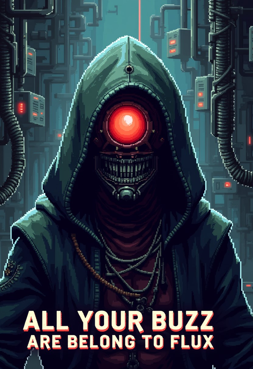 Warhammer Style Hooded Figure Mechanicus, red cyborg eye, mechanical background, pipes, greebles, electronics, pixel art style, at the bottom text that says "ALL YOUR BUZZ ARE BELONG TO FLUX" in windows font