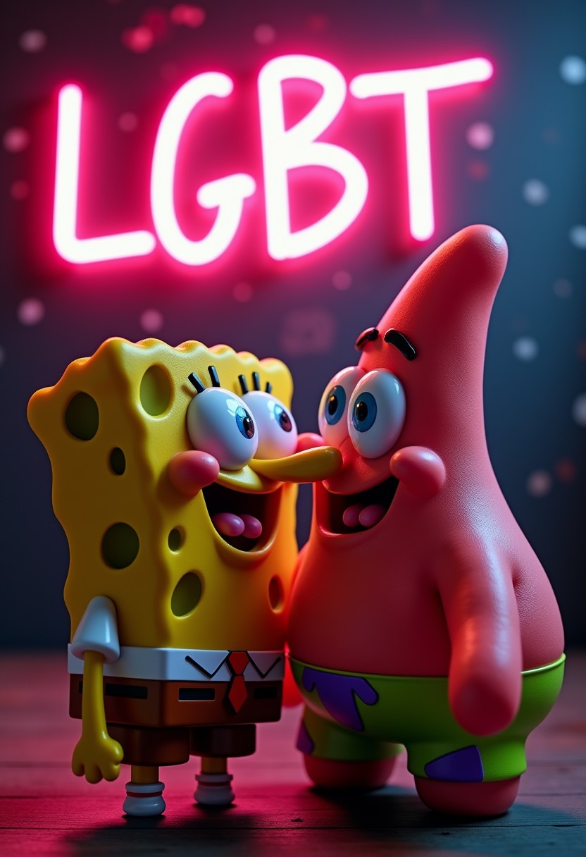 A photo of Patrick Star romantically kissing SpongeBob, with neon letters in the background that say "LGBT" , tongues touching