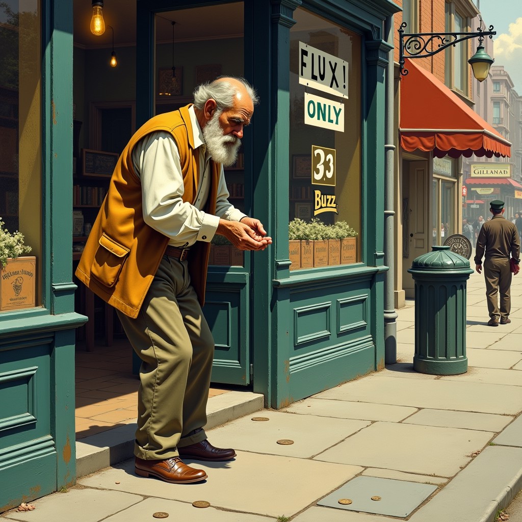 A beautifully detailed image from the Golden Age of illustration, in a style reminiscent of n c wyeth or maxfield parrish, of a destitute man standing in the street, outside a store with a sign in the window reading "FLUX! only 33 Buzz!", counting the few small coins in his palm